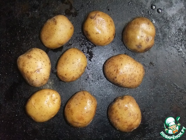 Картофель тщательно вымыть, немного сбрызнуть оливковым маслом - и на противень.