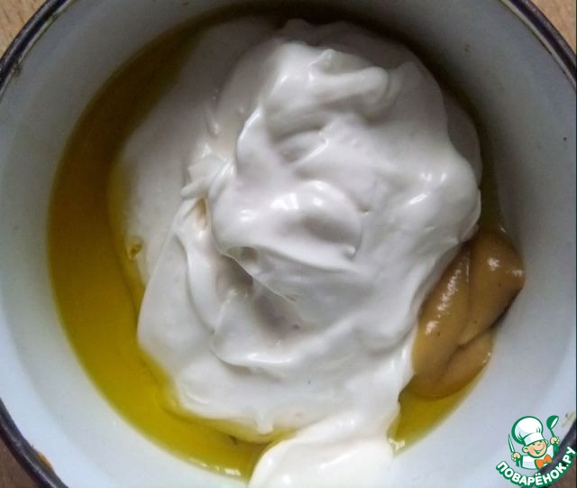 Смешать горчицу, майонез и оливковое масло.