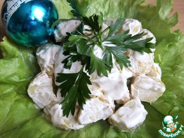 Картофель очистить и разрезать на четвертинки, или на половинки, в зависимости от величины картофеля. Есль картофель очень мелкий, можно положить целиком. В оригинальном рецепте используется молодой, мелкий картофель, который не чистят и кладут целиком. Получившимся соусом залить запеченный картофель. Хорошенько перемешать. Готово! Подавать холодным.
