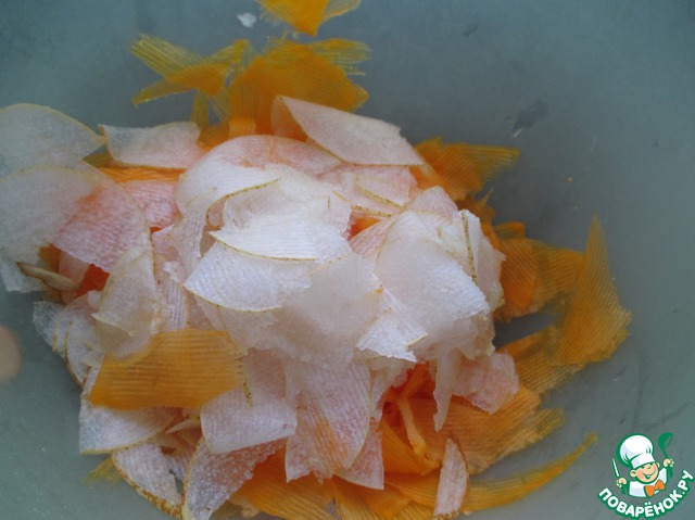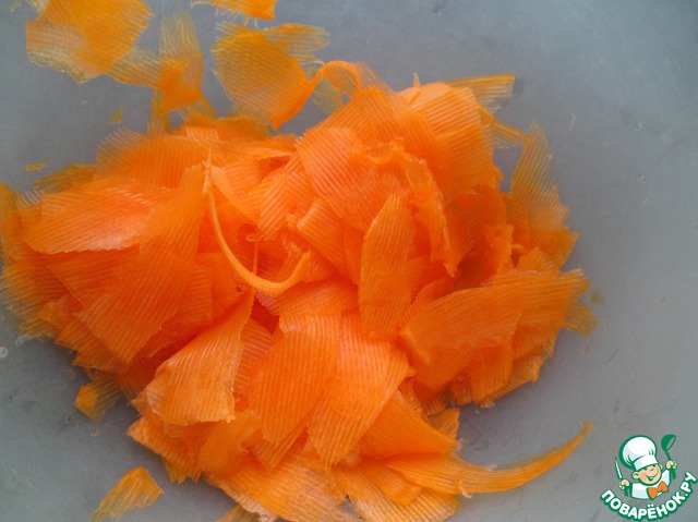Тыкву (150 г) очистить от семечек и кожуры, нарезать тонкими пластинками (я использовала терку).