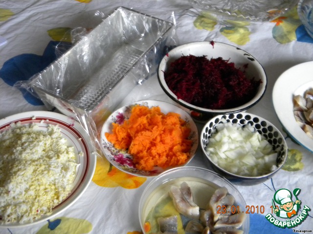 Сметану посолить, поперчить + горчица и немного масла от селёдки - взбить. Заправка готова.