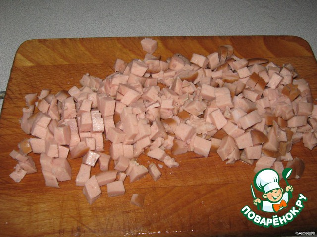 Ветчину или колбасу(по вкусу и по возможности)нарезаем кубиками