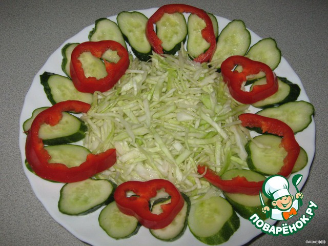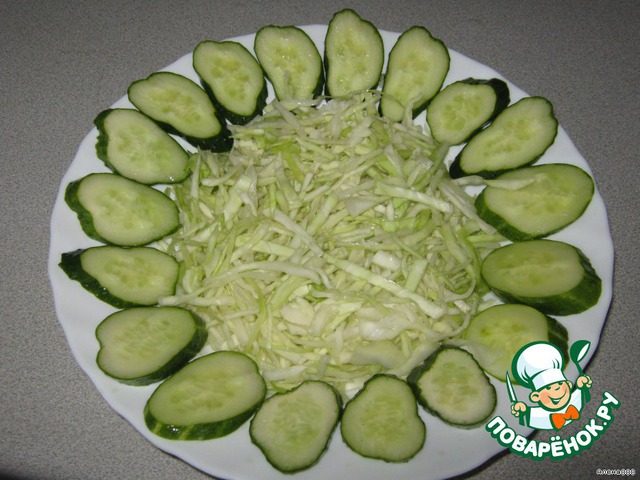 Выкладываем в центре блюда"подстилку" из капусты и обкладываем вокруг нарезанными кусочками огурца