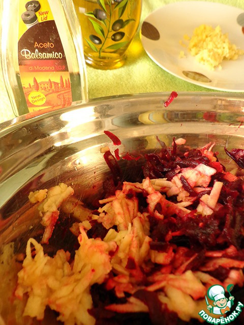 Смешать свеклу, яблоко, имбирь. Добавить соль, бальзамический уксус.