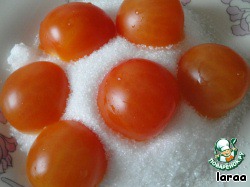 Помидорки разрезать пополам и обмакнуть в сахар.