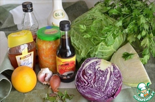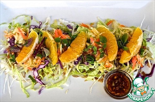 4. Выложить на тарелку разные виды капусты, чередуя. Сверху положить дольки апельсина, полить заправкой и подавать.