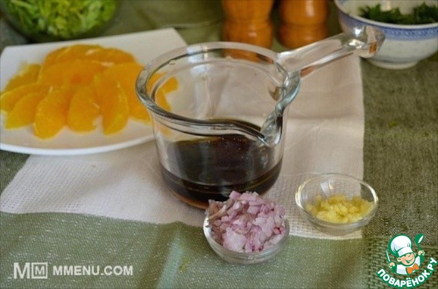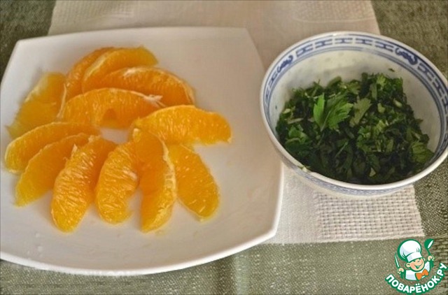 2. Апельсин очистить, разделить на дольки, удалить пленку и семена. Порубить петрушку.