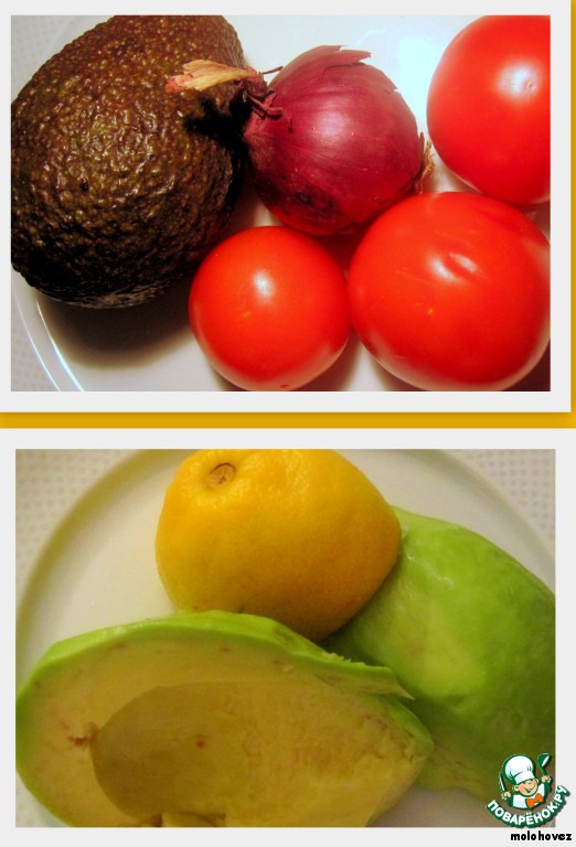 Вот наши ингредиенты. Авокадо разрезаем пополам, удаляем косточку и сбрызгиваем лимонным соком, чтобы мякоть не потемнела.
