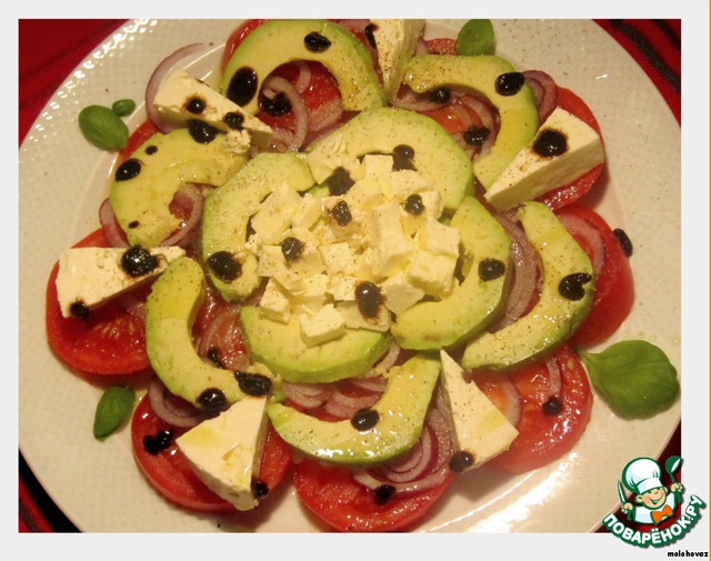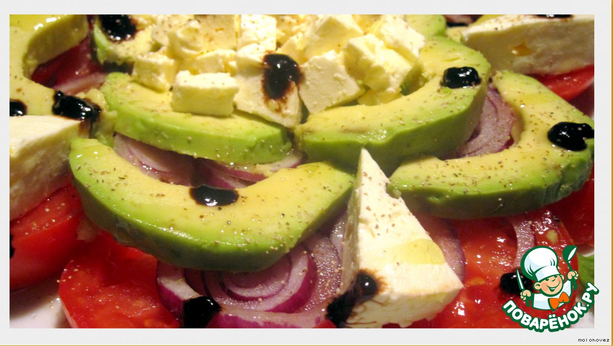 Сверху выложить авокадо и брынзу, поперчить, полить оливковым маслом и бальзамическим уксусом или кремом.