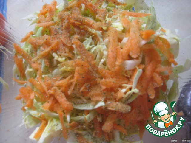 Нашинкуем капусту, натрем морковку на крупной терке, посолим, перемешаем.