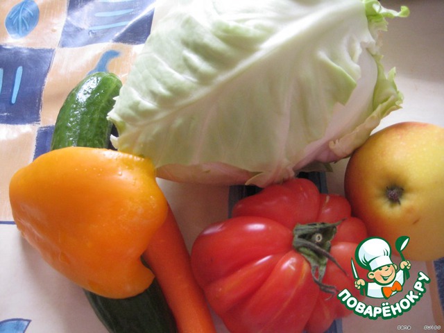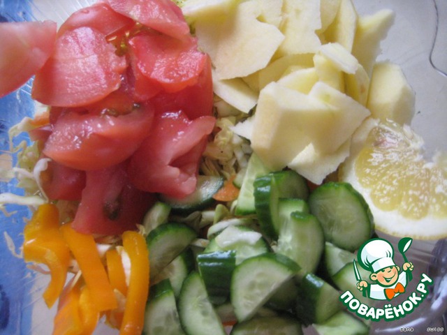 Остальные овощи и яблоко нарезаем крупно, яблоко сбрызнем лимонным соком, чтобы не темнело.
