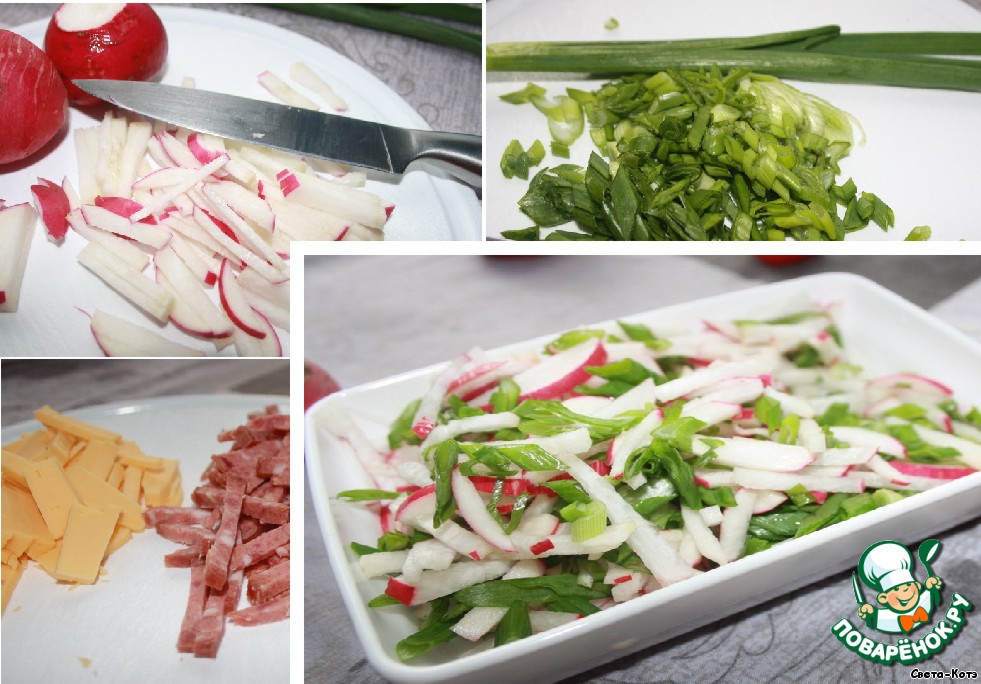 Сыр, редис и колбасу нарезать соломкой. Лук порубить.