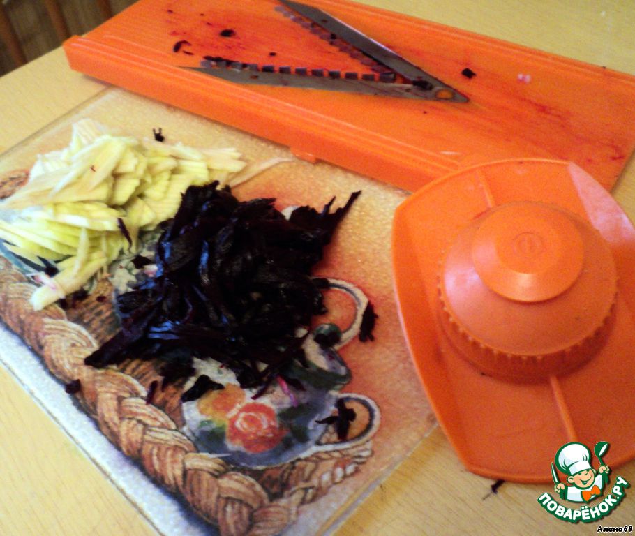 Нарезать очищенные яблоко и свеклу соломкой. Я это делаю с помощь терки Бернера - ровные ломтики готовы уже за пару минут.