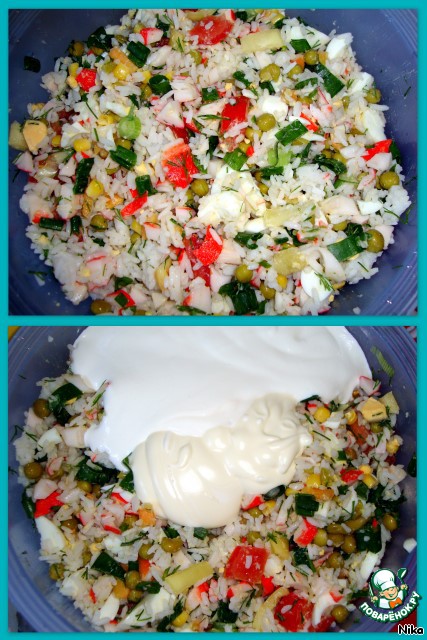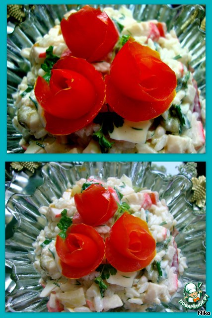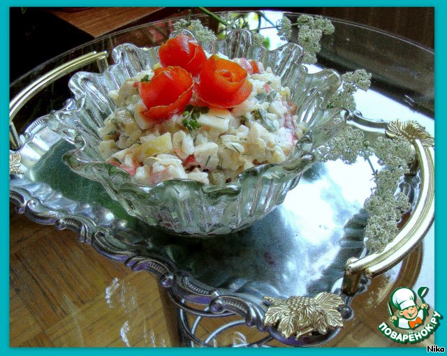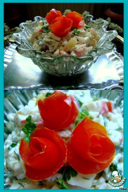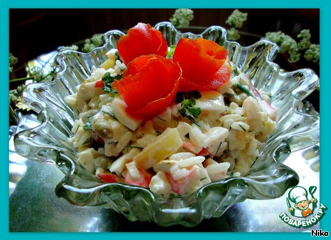 | Я люблю готовить разные салаты. Предпочитаю на вечер салат горячему блюду. У меня уже имеется несколько салатов на "Поварeнке". Этот салат с крабовым мясом. Наверно, я не единственная разместившая здесь похожий салат. Но, я не думаю, что имеется именно такой же. Не надо сильно критиковать меня за это, т. к. в повседневной жизни я стараюсь приготовить что-нибудь попроще и побыстрее... да, и мяса в жару совсем не хочется |