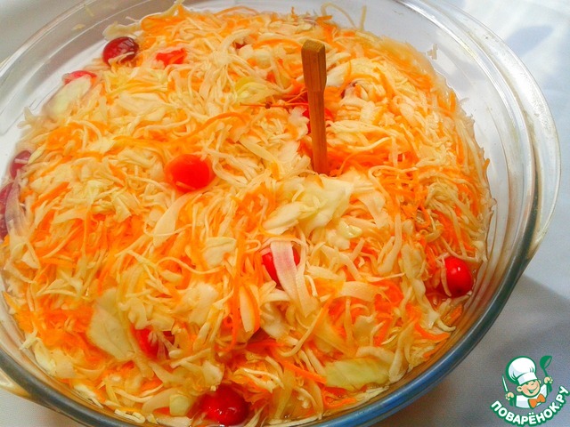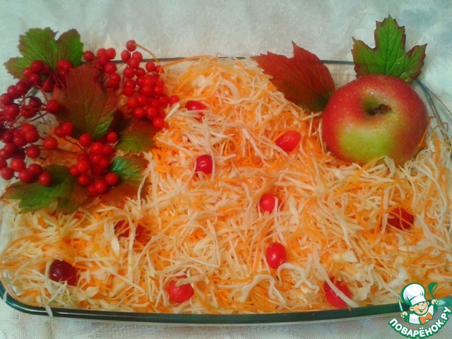 | Дорогие поварята! Предлагаю вам рецепт квашеной капусты с клюквой, морковью и тыквой. Я квашу таким образом капусту уже много лет. Надеюсь, что и вам понравится этот способ квашения. Великолепный витаминный и микроэлементный состав готовой капусты делает ее полезной не только для взрослых, но и для детей (не грудных), и беременных. Кормящим мамочкам лучше не увлетаться, чтобы не вызвать аллергию у малыша. |