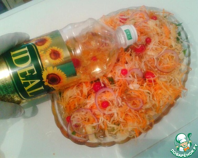 В готовую и отжатую от рассола капусту добавляем лук и запрввляем подсолнечным маслом. У меня замечательное маслице IDEAL. Оно имеет хорошую консистенцию и нежный вкус.