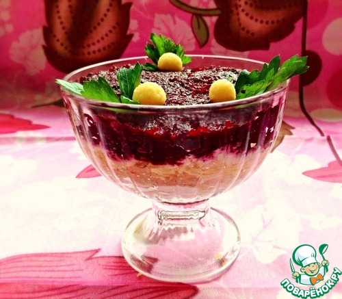 Свеклу натереть, чернослив мелко порезать и перемешать. Это наш последний слой. Украсить салат любимой зеленью, и скатать маленькие шарики из натертого сыра