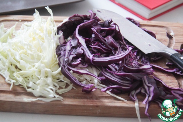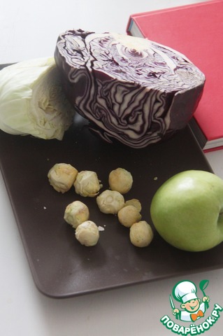 Основа нашего салата - капуста, точнее, 3 ее вида - красная, белая и брюссельская. Сразу хочу оговориться, что если Вы не любите брюссельскую капусту, то замените ее на брокколи или цветную.