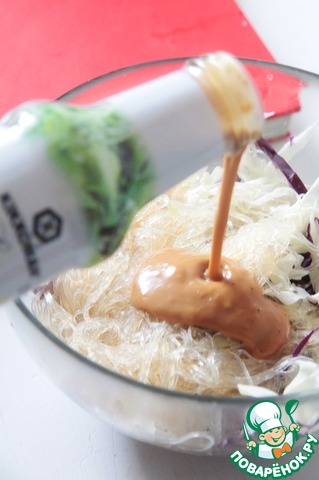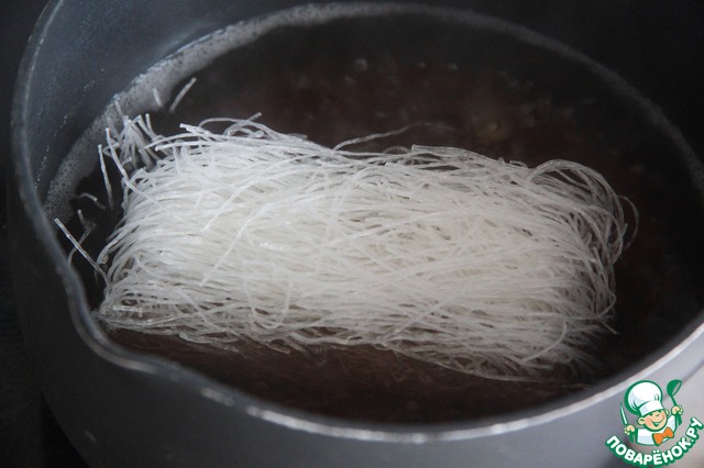 Снова доводим воду с соевым соусом до кипения и отправляем в нее фунчозу.