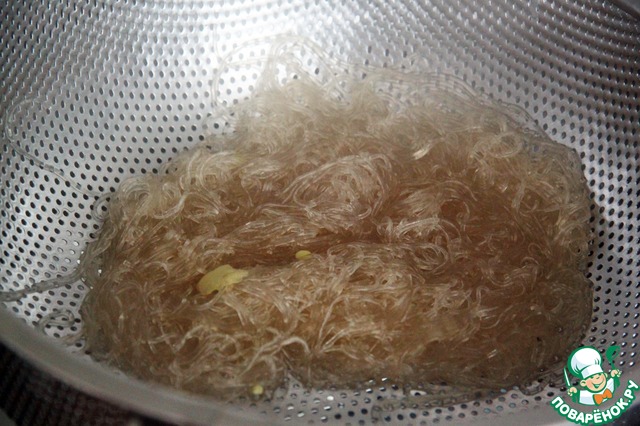 Варим фунчозу буквально 2-3 минутки, затем откидываем на дуршлаг и поливаем ледяной водой.