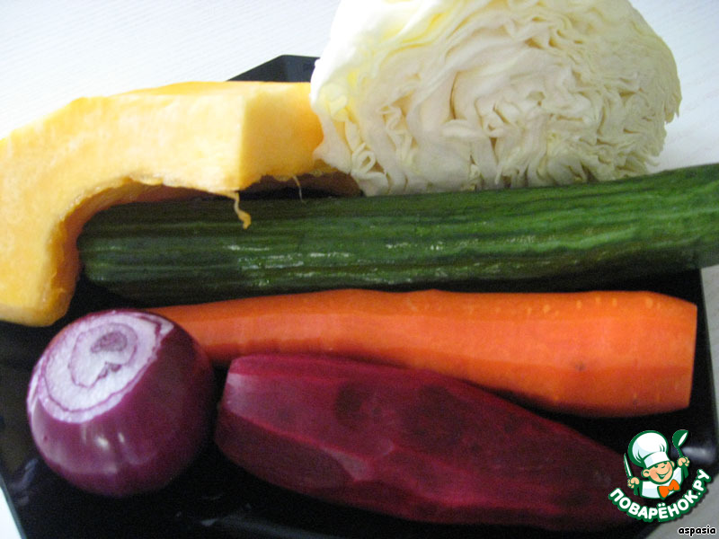 Для начала приготовьте овощи - помойте, почистите. Можно добавить болгарский перец - 1 шт.