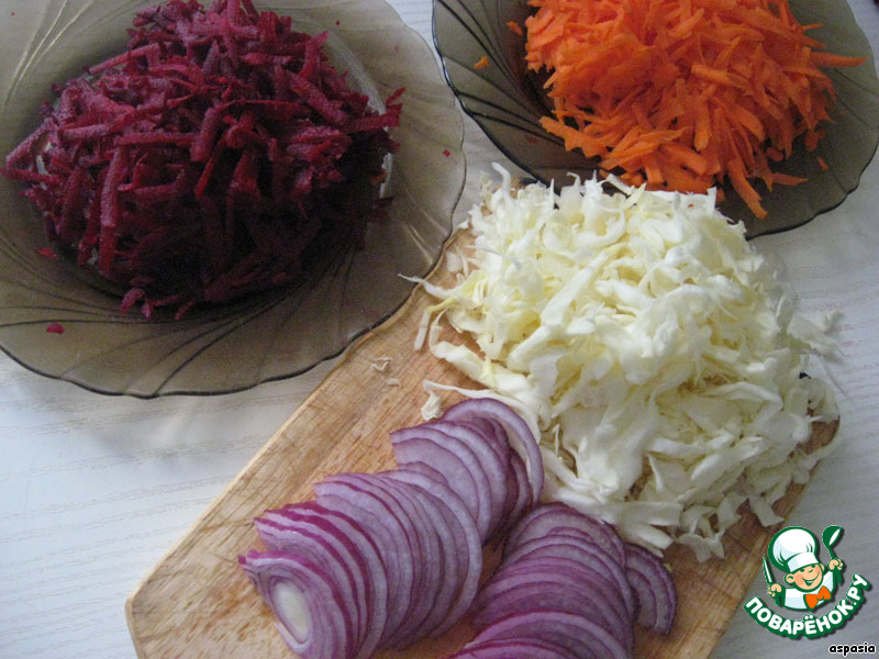 На крупной терке измельчаем морковь, свеклу, шинкуем капусту, режем лук полукольцами.