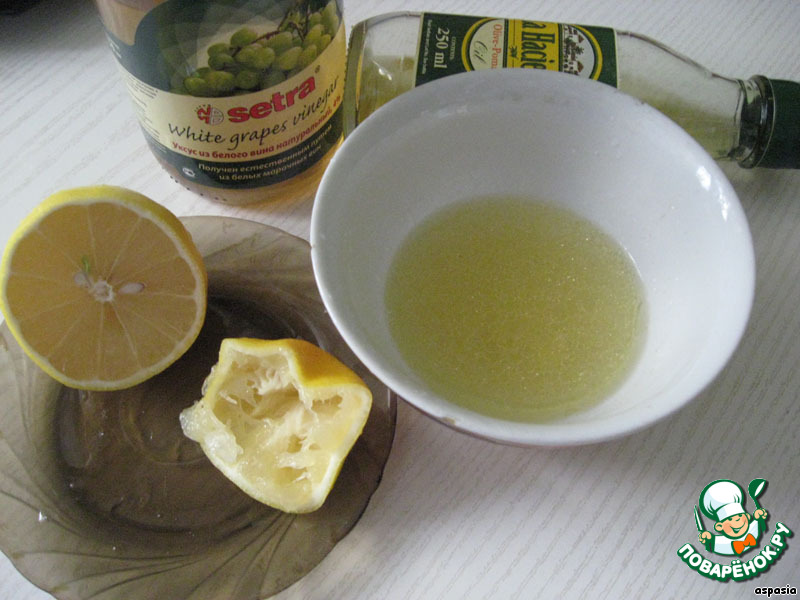 Для заправки смешала оливковое мало, винный (можно яблочный) уксус, выжала половинку лимона.