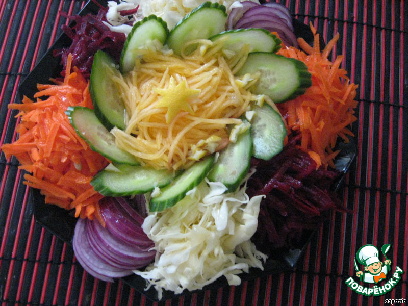 | Разноцветная радуга, веселая карусель... И все это в ОДНОМ салатике. Рецепт попал ко мне от подруги, которая вечно сидит на диетах. А мы, ведь, тоже любим похудеть, особенно после таких пиров! Все ингредиенты - просты и доступны... Варианты возможны... Дарю! |