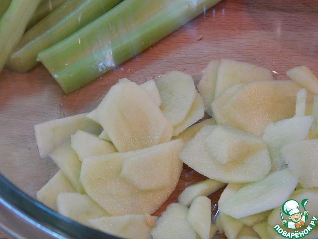 Нарезать сельдерей тоненькими ломтиками.