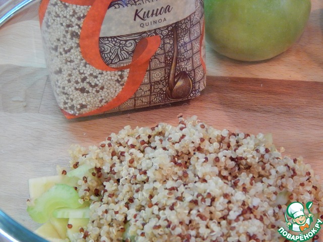 Киноа сварить и остудить. Тем временем яблоки почистить и нарезать на дольки. Сбрызнуть лимонным соком.
