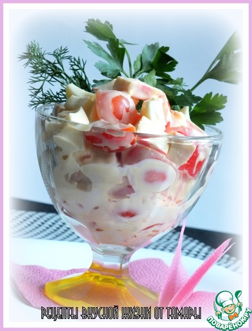 | Хочу поделиться рецептом вкусного салата. Очень прост в приготовлении, на вкус супер. Мне кажется, что в этот салат можно добавить немного пикантности, в виде чесночка. Ну это уже на любителя естественно... |