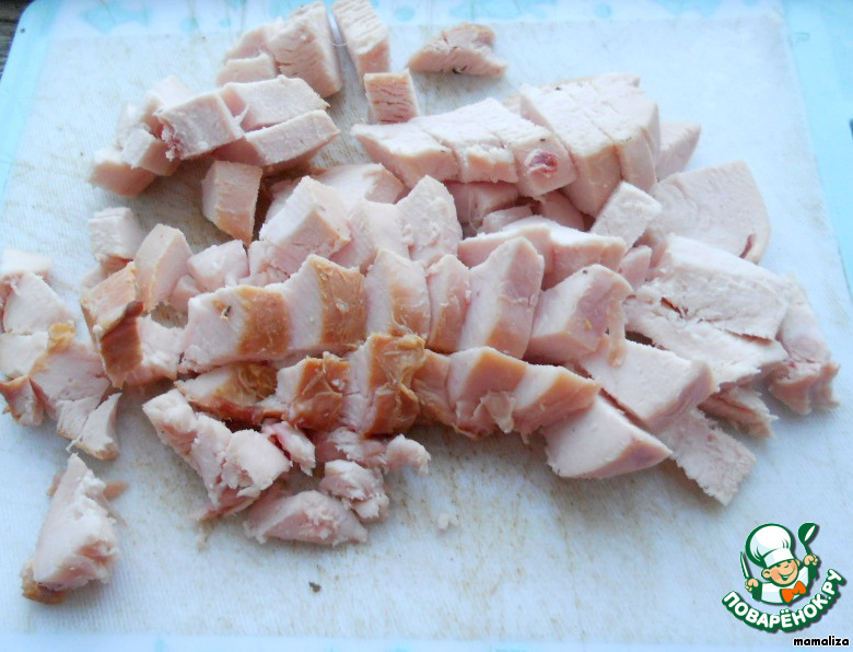 Фасоль отварить с добавлением чабера в течение 8 минут. Остудить, нарезать на кусочки 3-4 см.