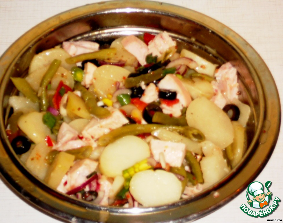| Я нашла этот рецепт в старом номере журнала Burda. Там он называется "Летний картофельный салат". А мне он показался абсолютно зимним, ведь сейчас все продукты можно купить в любое время года. А салат этот едят теплым. Чашка такого салата вполне заменит ужин. |