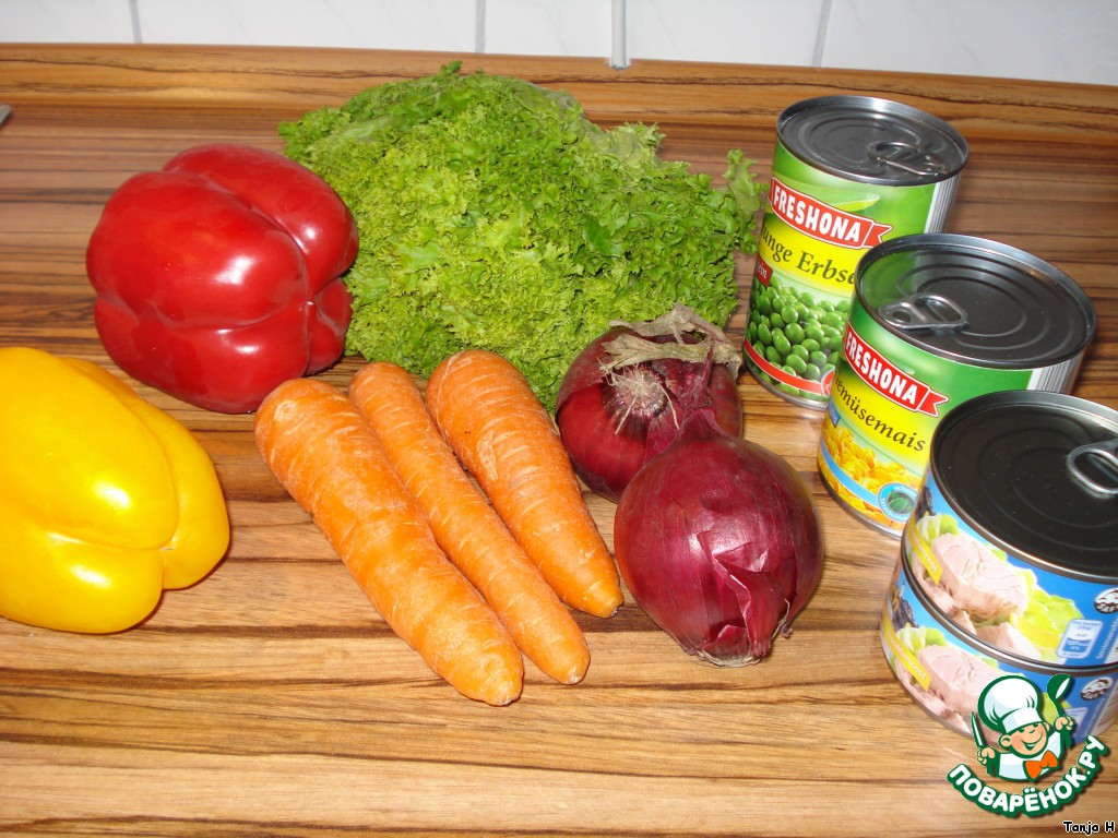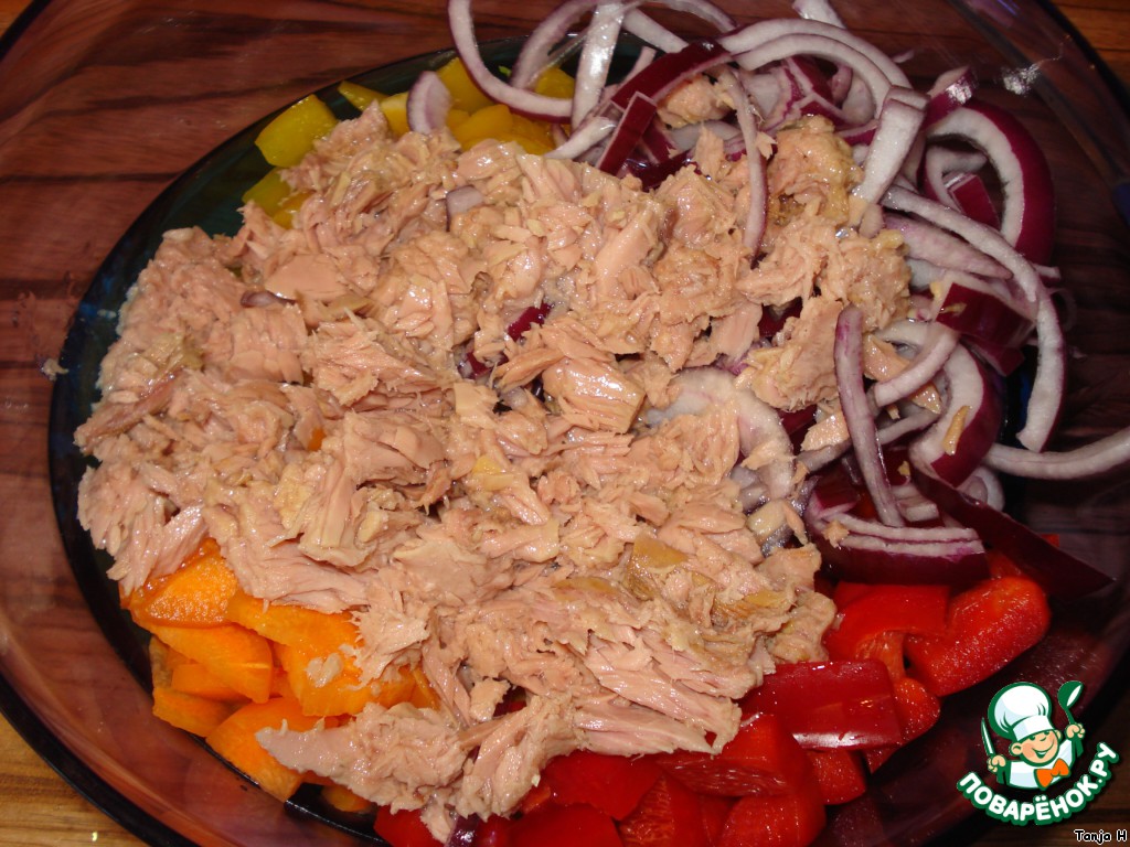Выкладываем салат, паприку, морковь, лук, тунец в большую салатницу.