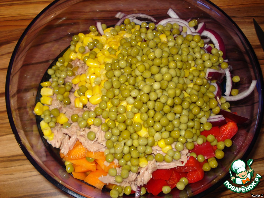 Сливаем с горошка и кукурузы жидкость и добавляем их в салат.