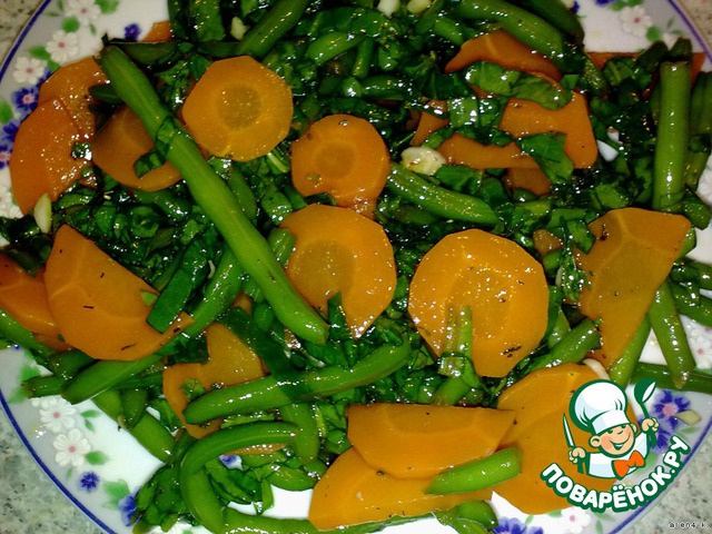 В кастрюльке закипятить воду, положить морковь и варить 2 минуты. Добавить фасоль. Вместе овощи проварить еще 2-3 минуты. Отбросить на дуршлаг, обдать холодной водой (чтобы сохранить яркий цвет). Смешать в миске морковь, фасоль и шпинат.