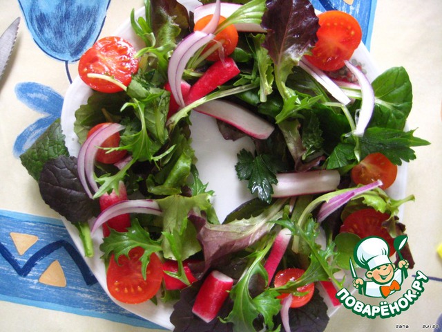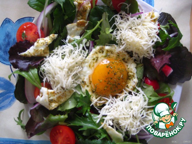 | Зеленый салат с овощами и "глазуньей" в бальзамическом соусе - красиво и витаминно. Приятного аппетита! |