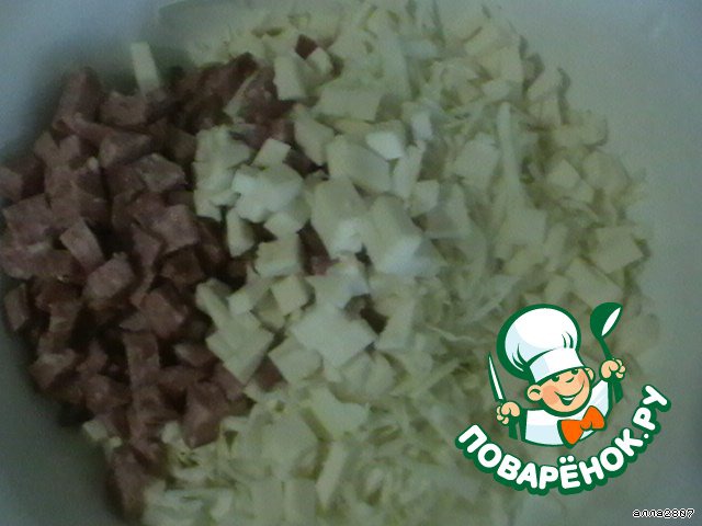 Нашинковать капустку, нарезать кубиками колбасу, кубиками сыр или плавленный сырок.