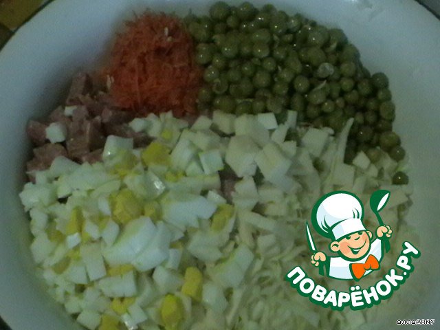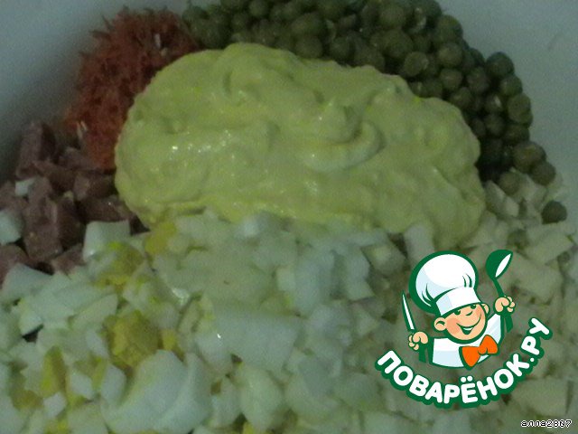 С горошком напоминает оливье, только сочнее.