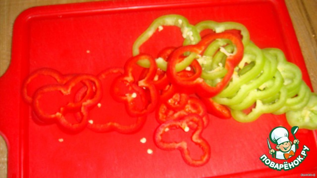 Болгарский перец (желательно красный и зелёный) порезать кружочками.