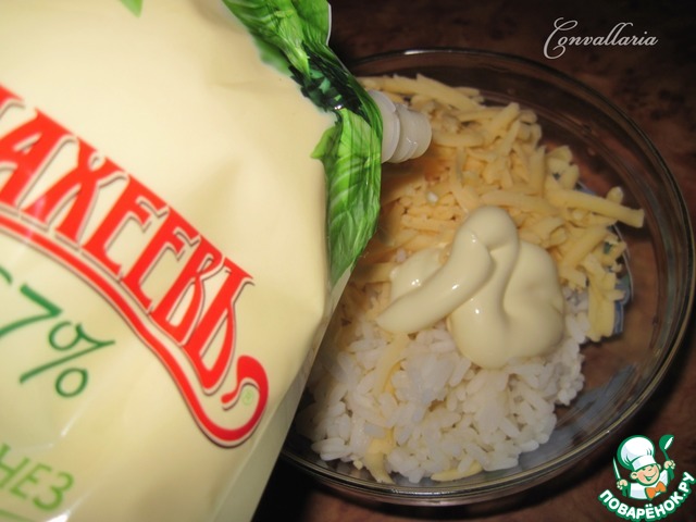 Сыр натереть на крупной терке, добавить отварной рис и майонез. Хорошо перемешать.