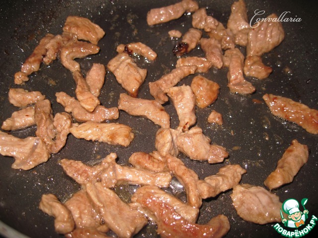 Мясо нарезать тонкими полосками, обжарить на разогретом масле до готовности.