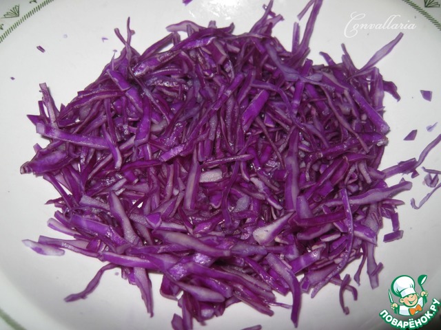 Краснокочанную капусту тонко нашинковать, добавить щепотку соли и слегка помять руками.