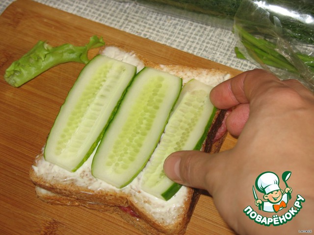 Далее - второй кусок жареного хлеба, опять-таки промазанного майонезом, и сверху пластинки свежего огурца. Посолить.