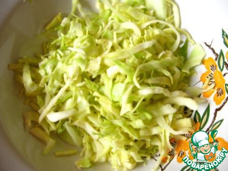 Капусту тонко нашинковать, чуть-чуть присолить и помять.