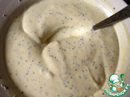Приготовить заправку: смешать 1/3 стакана сметаны, 1/4 стакана майонеза, 1/4 стакана яблочного сока, 1 ст. л. сухого мака, добавить соль и горчицу по вкусу. Я использовала медовую горчицу, вы можете добавить, к примеру, яблочную, рецепт есть на сайте. Можно взять и французскую горчицу, конечно. Обязательно попробуйте заправку, отрегулируйте ее на свой вкус.