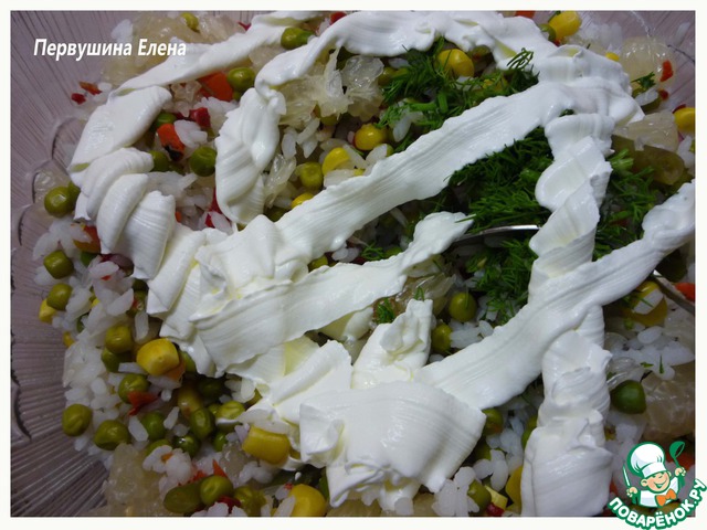 Дольки помело освобождаем от пленки и перегородок. Нарезаем кубиками и вместе с консервированным горошком кладем в салат. (В отличие от других цитрусовых, помело не выделяет сок и очень легко чистится).