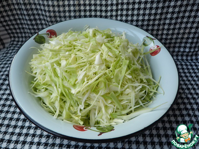 Нашинковать капусту. Слегка посыпать солью и перетереть