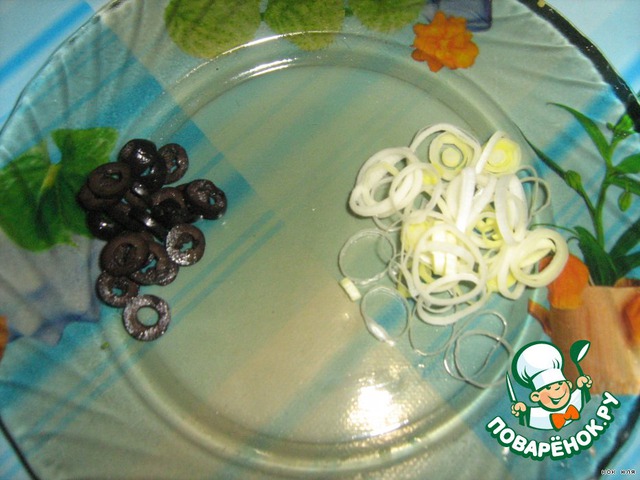 Оливки и лук режем кружочком. Я взяла лук порей, збрызнула лимоном и посыпала перцем. А красный лук надо мариновать с уксусом, сахаром, перцем чёрным молотым и солью.