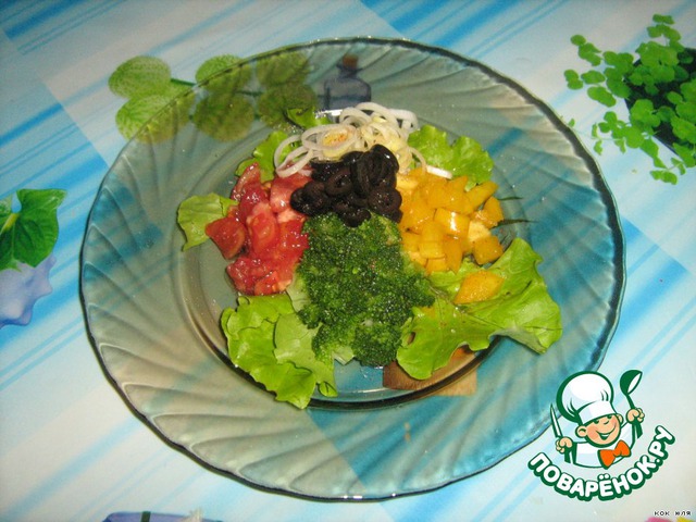 Все ингредиенты укладываем на лист салата кучками, сверху - оливки и поливаем маслом оливковым. Я этот салат не солю. Капуста подсолена, оливки тоже, лук - маринованный, помидоры имеют приятный кисо-сладкий вкус. Приятного аппетита.